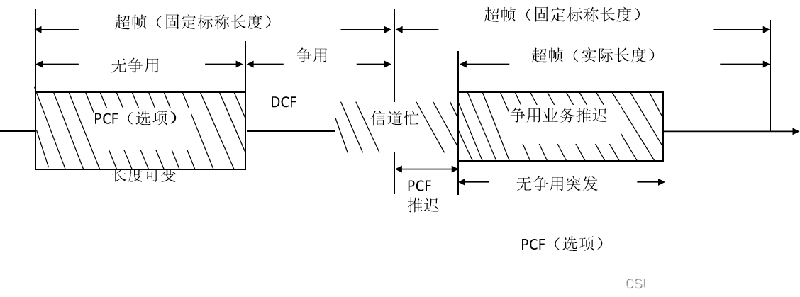 到了下一个超帧的开始,点协调程序就在物理媒介(PM)上争用信道。若信道空闲,则点协调程序立即接入信道。但信道也可能像图中那样处于忙状态。这时点协调程序就等待,直到信道空闲时才能接入信道。在这种情况下,超帧的实际长度就缩短了。