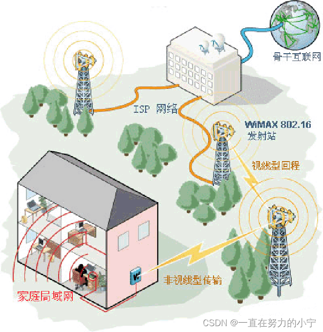 WiMax 设备通常由安装在建筑物上的基站或塔式基站和家庭或办公场所内的用户接入终端组成,用户在局域网内部可使用任意局域网技术传送语音、数据和多媒体信号,对外连接则通过定向天线向服务提供商的蜂窝塔发送信号在蜂窝塔接收基站接收到多个用户发来的信号后,进行处理(补偿信号失真和衰落等) 后,通过无线或有线信道将信号传送到满足802. 16 协议的交换中心,然后交换中心将数字信号流接入互联网或电话网进行传输。
