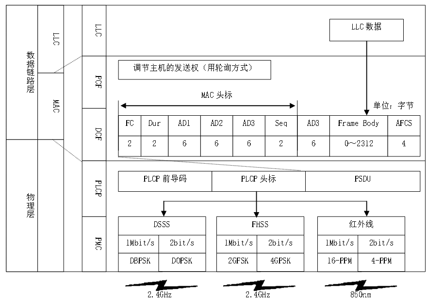 无线局域网IEEE 802.11详细的数据链路层、物理层分层如图所示。