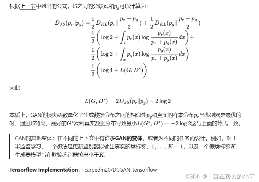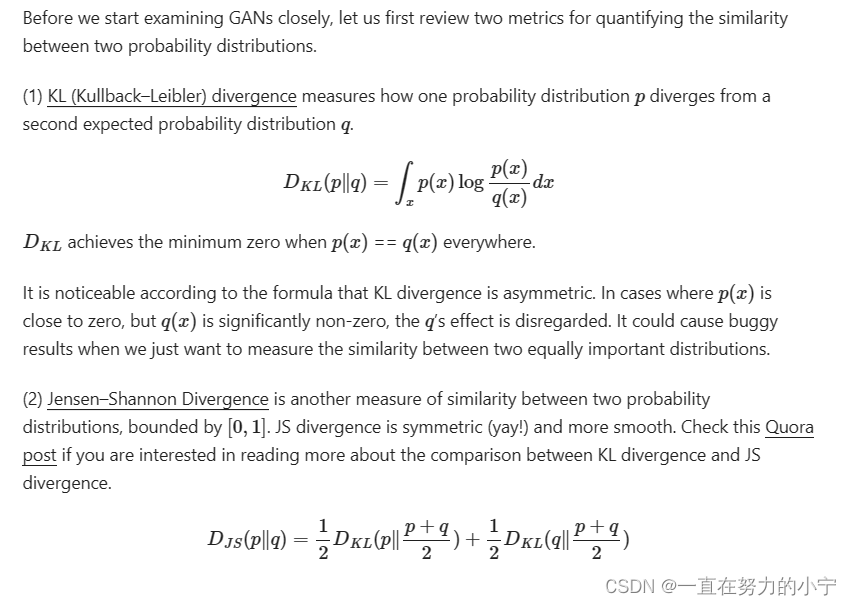 一些人认为(Huszar,2015)GANs取得巨大成功背后的一个原因是将损失函数从传统最大似然方法中的不对称KL散度转换为对称JS散度。