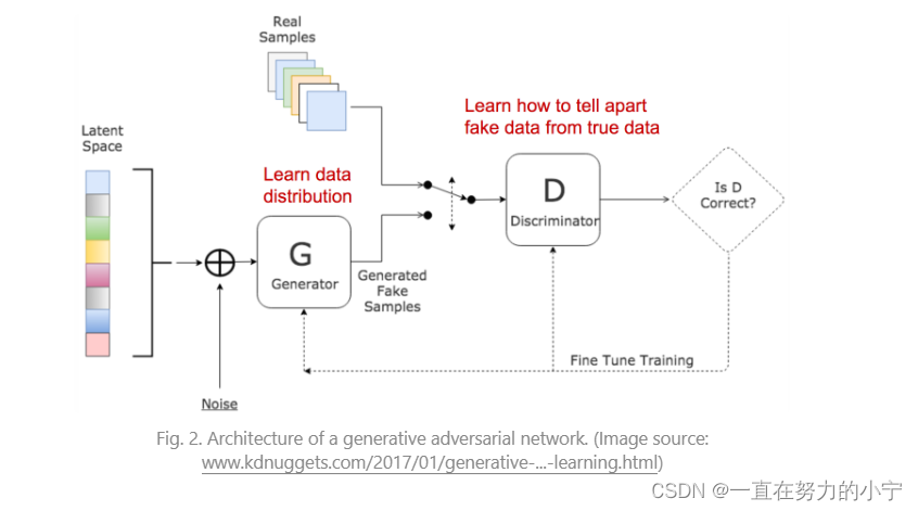 - 发电机G:输出给定噪声变量输入的合成样本z (z带来潜在的产出多样性)。它被训练来捕获真实的数据分布,以便其生成样本可以尽可能真实,或者换句话说,可以欺骗鉴别器提供高概率。