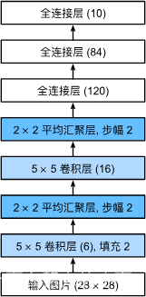 请注意,在整个卷积块中,与上一层相比,每一层特征的高度和宽度都减小了。 第一个卷积层使用2个像素的填充,来补偿5×5卷积核导致的特征减少。 相反,第二个卷积层没有填充,因此高度和宽度都减少了4个像素。