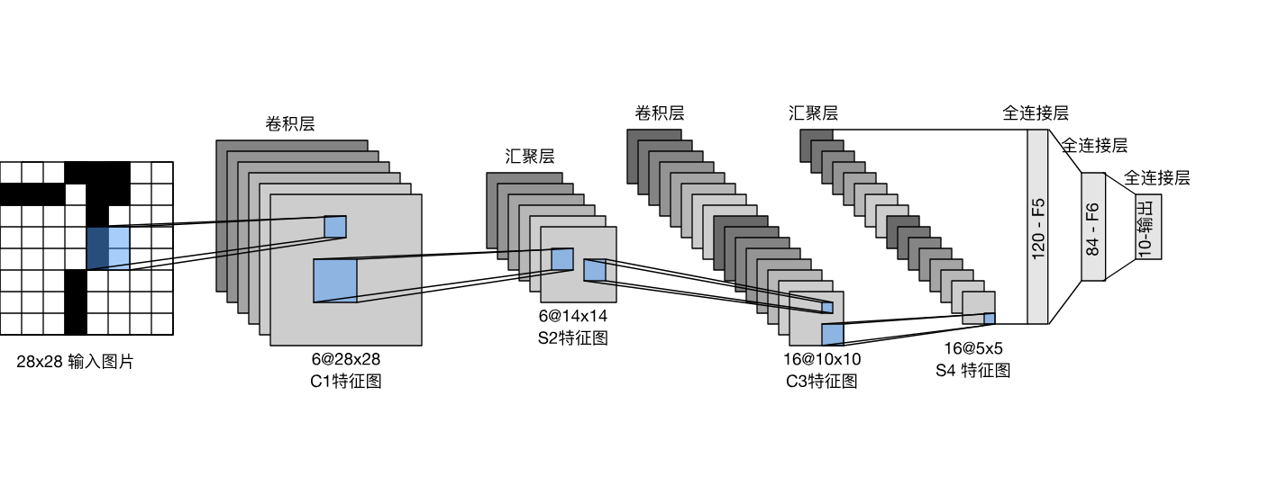 我们对原始模型做了一点小改动,去掉了最后一层的高斯激活。除此之外,这个网络与最初的LeNet-5一致。