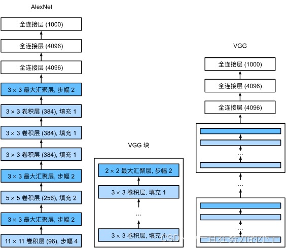 VGG神经网络连接 图7.2.1的几个VGG块(在vgg_block函数中定义)。其中有超参数变量conv_arch。该变量指定了每个VGG块里卷积层个数和输出通道数。全连接模块则与AlexNet中的相同。