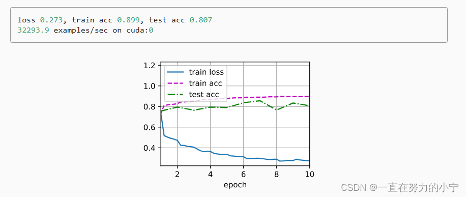 和以前一样,我们将在Fashion-MNIST数据集上训练网络。 这个代码与我们第一次训练LeNet( 6.6节)时几乎完全相同,主要区别在于学习率大得多。