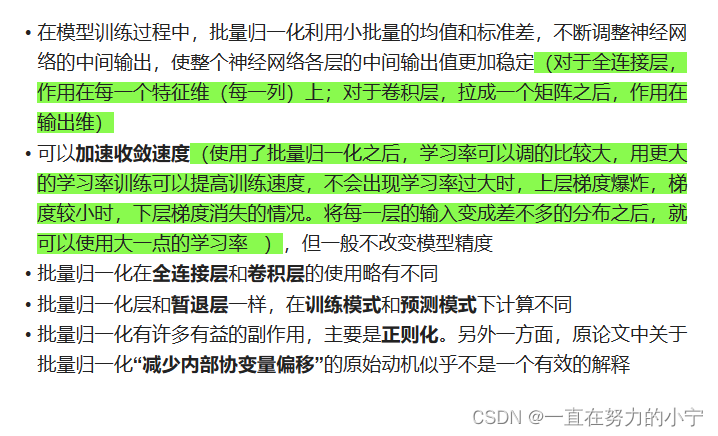 本文详细阐述了批量归一化在训练神经网络中的重要性,解释了它为何能加速收敛,以及在全连接层和卷积层中的应用。通过实例展示了如何在LeNet中使用批量规范化并分析了其参数。