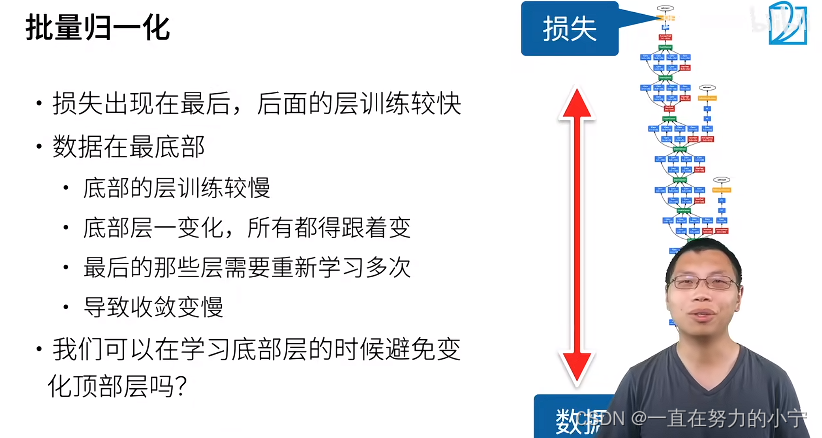 上面的梯度比较大,那么每次更新的时候上面的层就会不断地更新;但是下面层因为梯度比较小,所以对权重地更新就比较少,这样的话就会导致上面的收敛比较快,而下面的收敛比较慢,这样就会导致底层靠近数据的内容(网络所尝试抽取的网络底层的特征:简单的局部边缘、纹理等信息)变化比较慢,上层靠近损失的内容(高层语义信息)收敛比较快,所以每一次底层发生变化,所有的层都得跟着变(底层的信息发生变化就导致上层的权重全部白学了),这样就会导致模型的收敛比较慢。