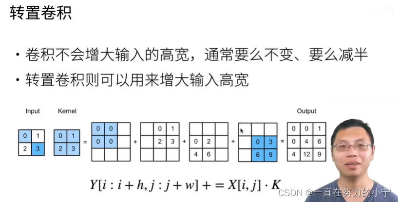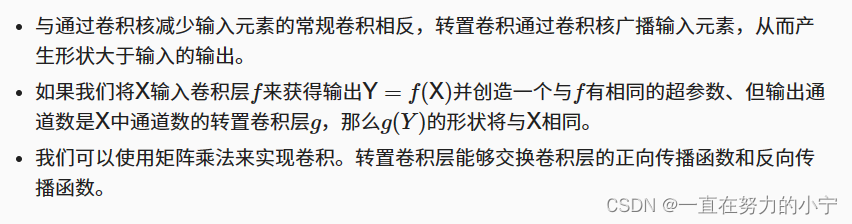 语义分割的问题在于需要对输入进行像素级别的输出,但是卷积通过不断地减小高宽,不利于像素级别的输出,所以需要另外一种卷积能够将高宽变大