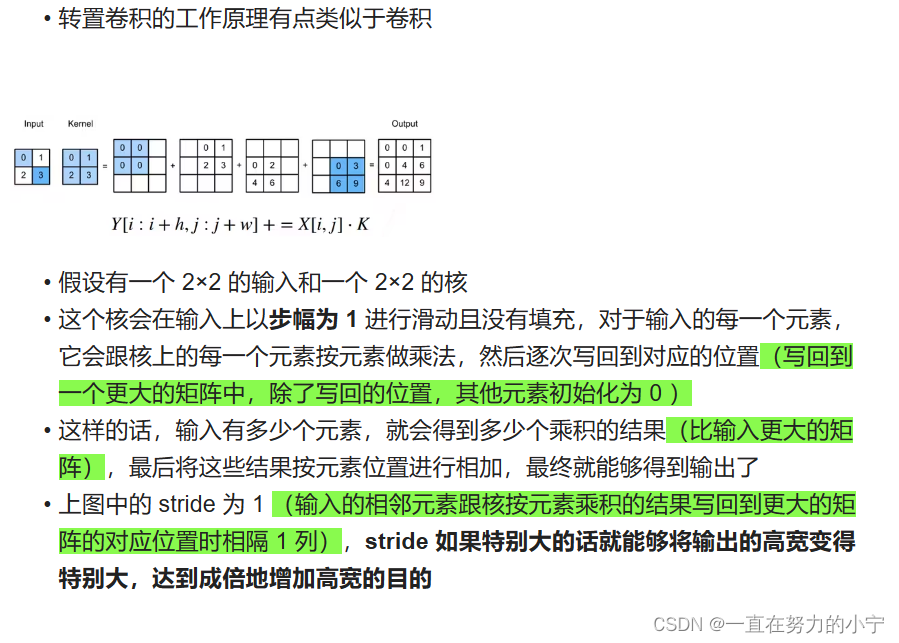 转置卷积的关键特点是在卷积操作中使用了步幅和填充,使得输出特征图的尺寸可以与输入特征图不同。通过调整转置卷积的参数,可以控制输出特征图的尺寸和分辨率。