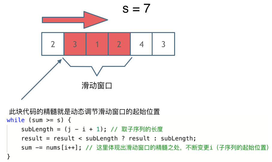 本题中,主要要理解滑动窗口如何移动 窗口起始位置,达到动态更新窗口大小的,从而得出长度最小的符合条件的长度。