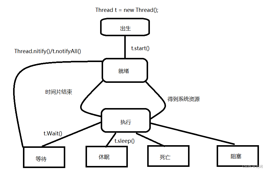 yeild()方法使同优先级的线程有进入可执行状态的机会,如果当前线程放弃执行权,会再度回到就绪态。对于支持多任务的操作系统来说,不需要调用yeild()方法,因为有时间片。