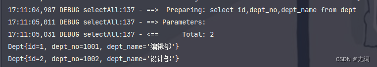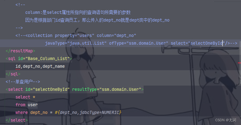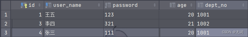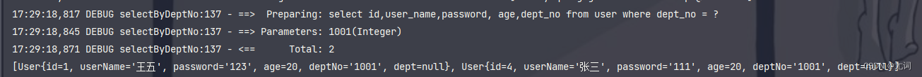 上文我们在dept中是将user对象的字段拿出来一个一个做了对照,那我们这边就要用到外连接查询,不知不自觉的竟然将多表联查也讲到了,记得在sql标签中将id和dept_no前加上"表名.",因为user表中也有id和dept_no,需要告诉数据库我查的是谁的id和dept_no