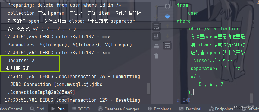 foreach还是很简单的,下面是测试类的代码(增删改都需要提交事务,sqlsession.commit()),我的数据库里有id为5,6,7的数据,那我们就删除5,6,7