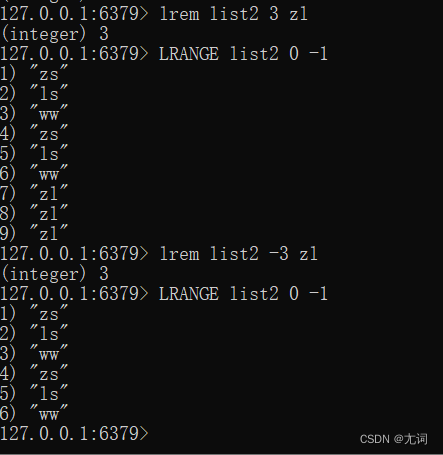 从列表左侧开始,删除count个值为value的数据,如果count为负数,则从右边开始:lrem listname count value