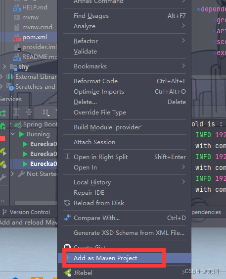 如果.....你的pom.xml图标不是蓝色的M,右键,往下看看,找到add xxx as maven