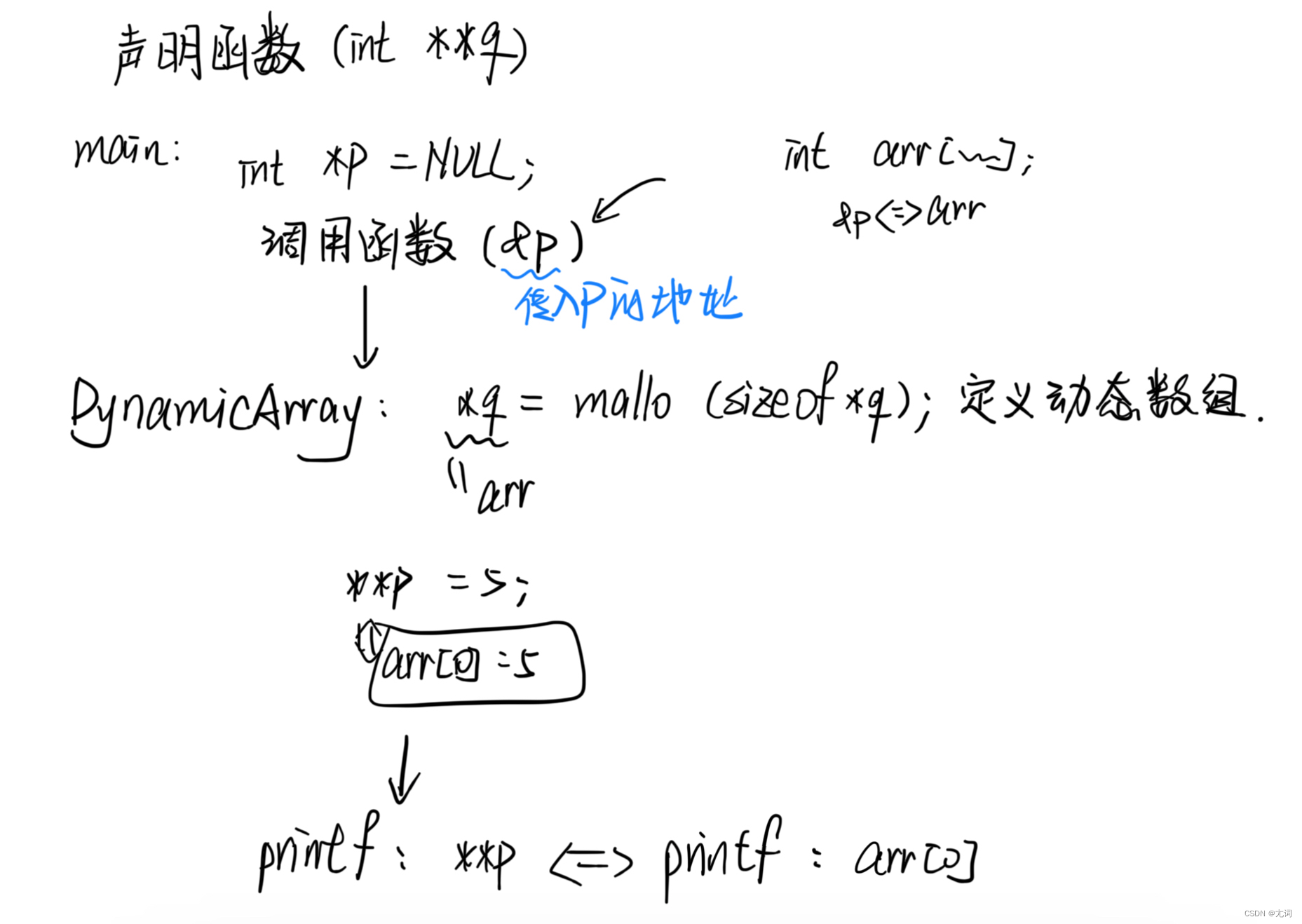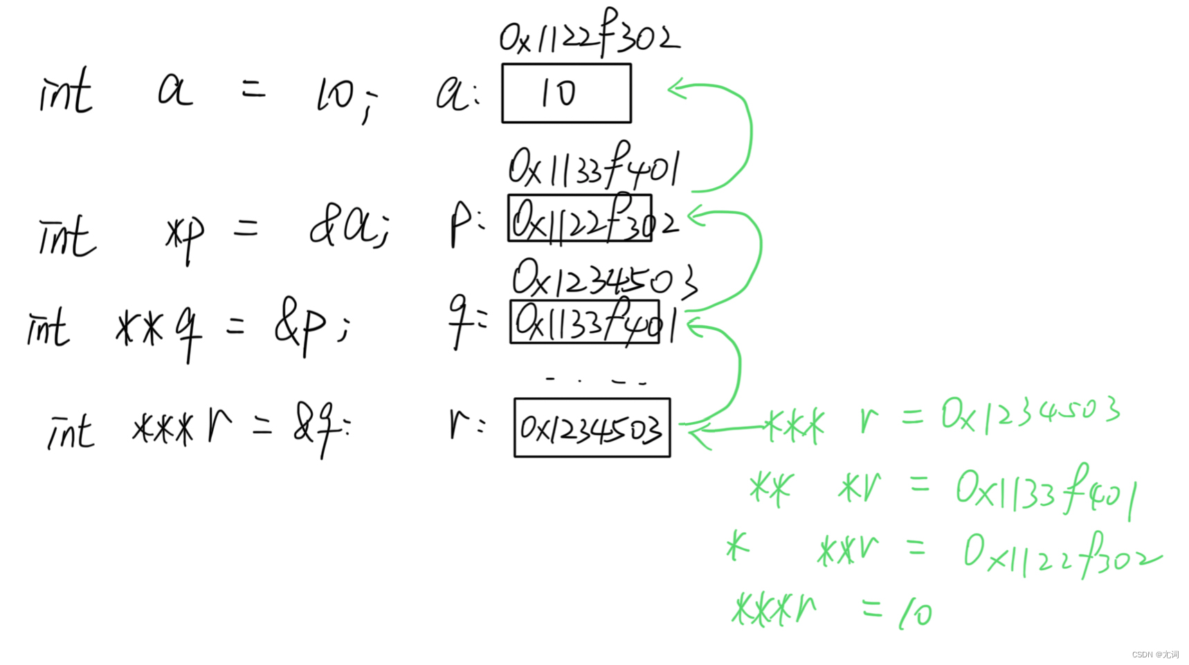 int **p = &q; //因为这种变量q的基类型是int,所以&q的基类型是int *型。如果定义一个能指向int *型变量的指针变量,有两个要求:首先它是指针变量,即一个*,其次该指针变量指向的是int*型的数据(存放int*型的地址),所以就是int**。几个*就是几级指针。