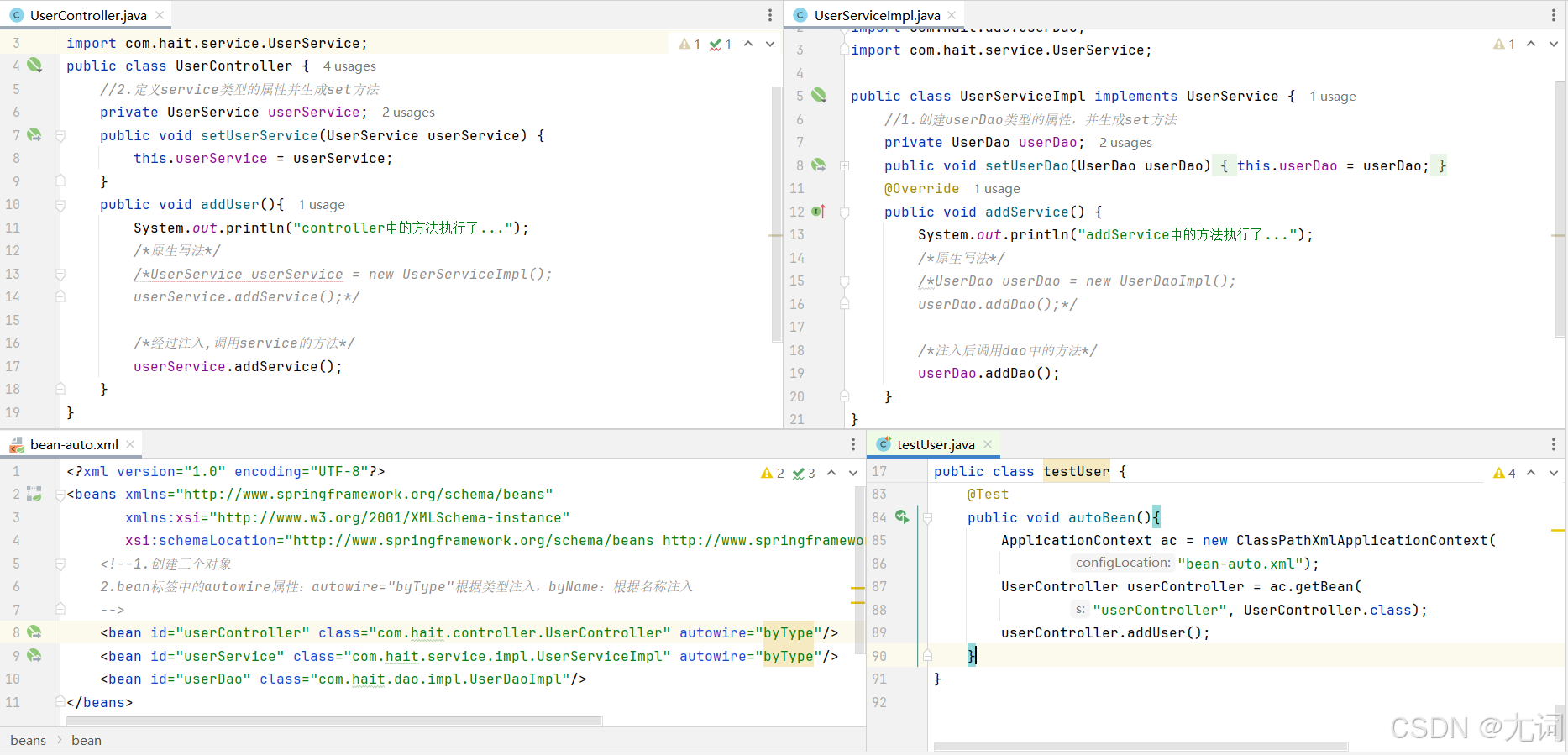 <bean id="userController" class="com.hait.controller.UserController" autowire="byType"/>