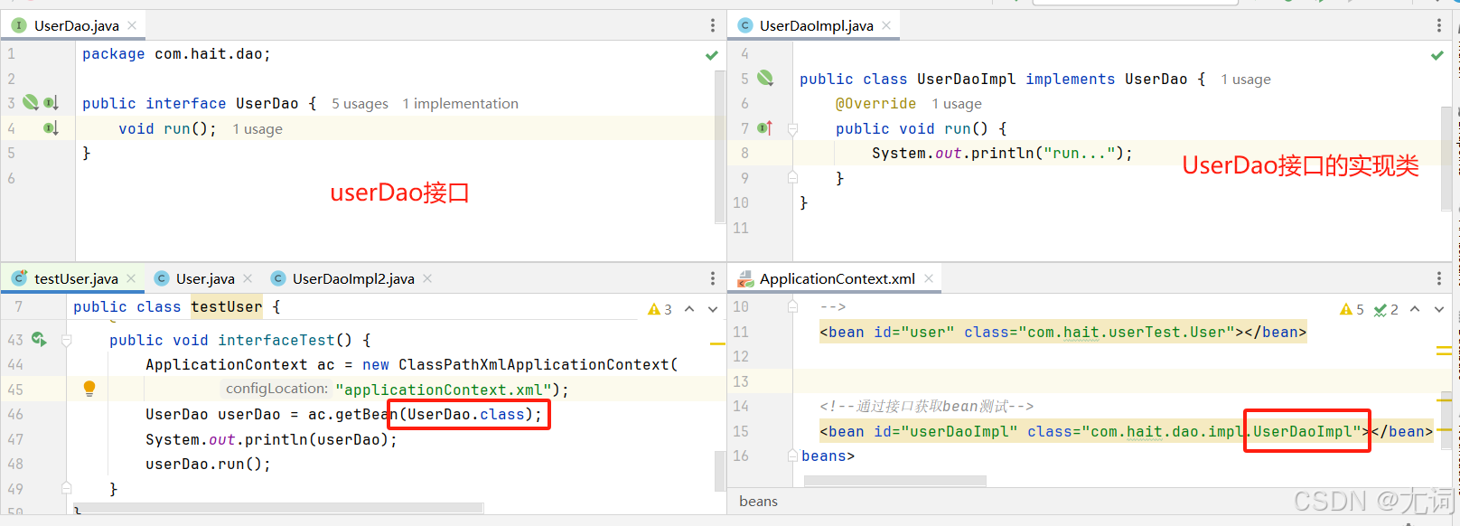 <bean id="userDao" class="com.hait.dao.impl.UserDaoImpl"/>
