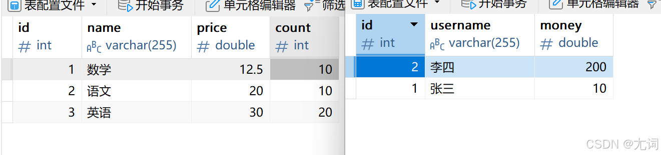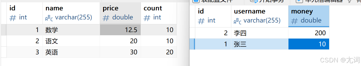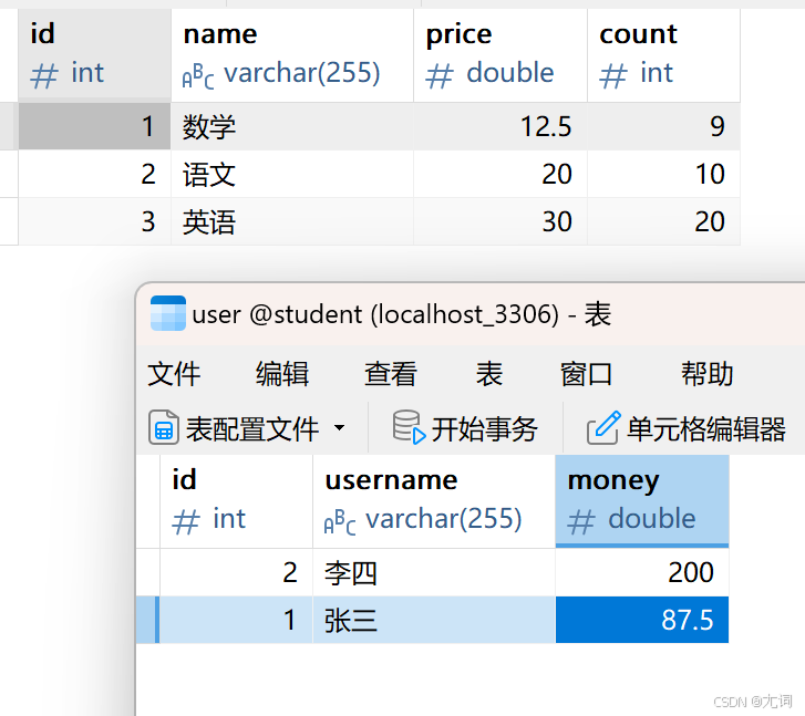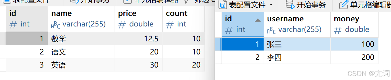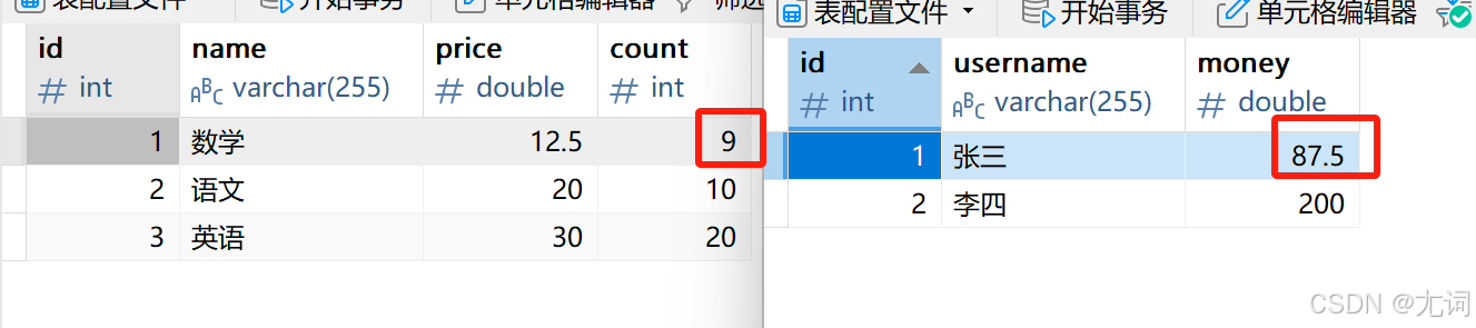 测试:张三买一本数学书(还没加事务,那么如果买书张三余额不够的话,库存已经-1,张三的余额不变,这肯定是不符合逻辑的)