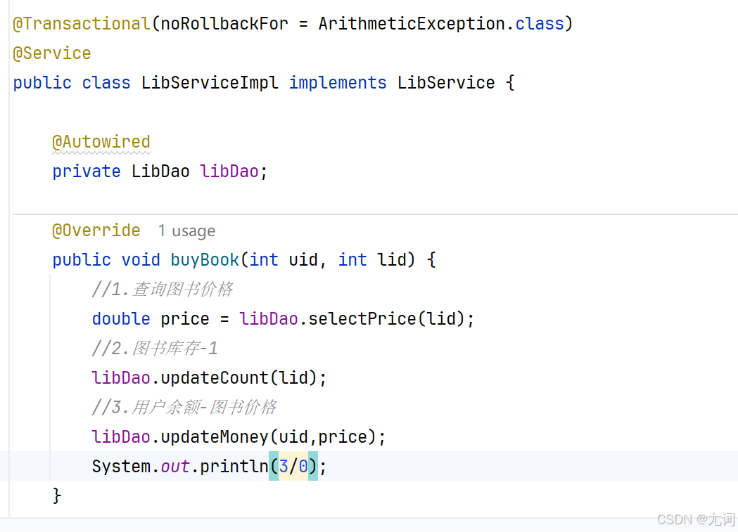 假设买书的方法中出现了除数为0的异常,让它不进行回滚:
