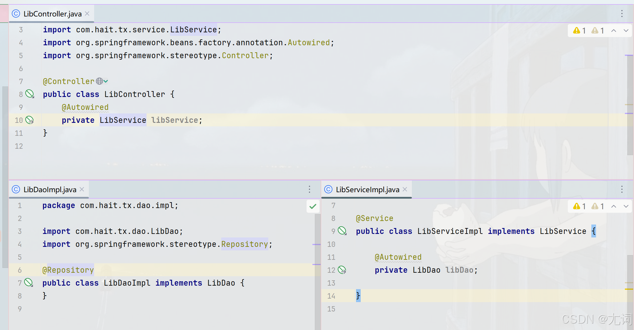 流程:controller调用service,service调用dao,所以在controller曾注入service,在service曾注入dao