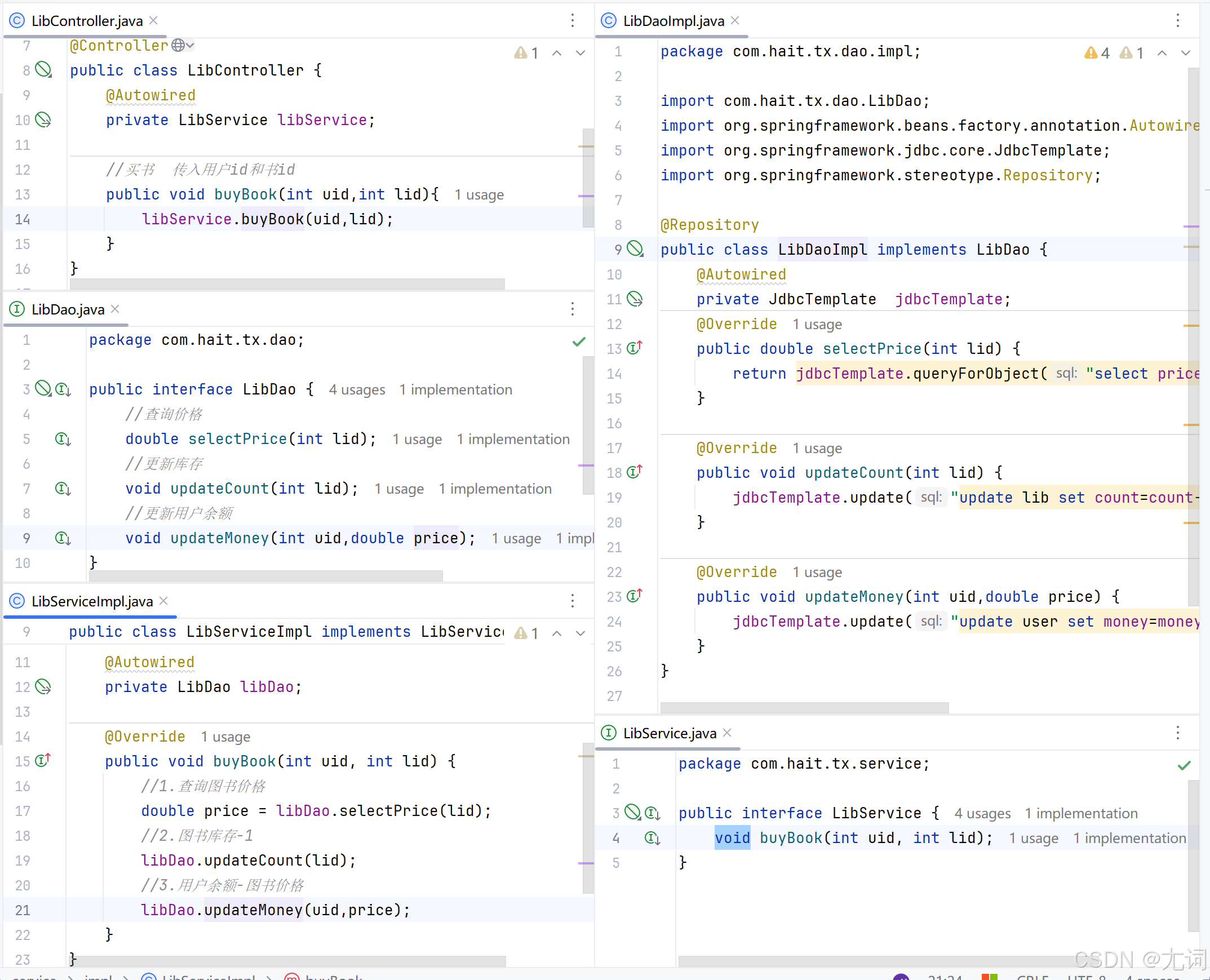 @Transactional注解加在类上则会影响类中所有方法,加在方法上只会影响该方法,在LibServiceImpl类上加上该注解
