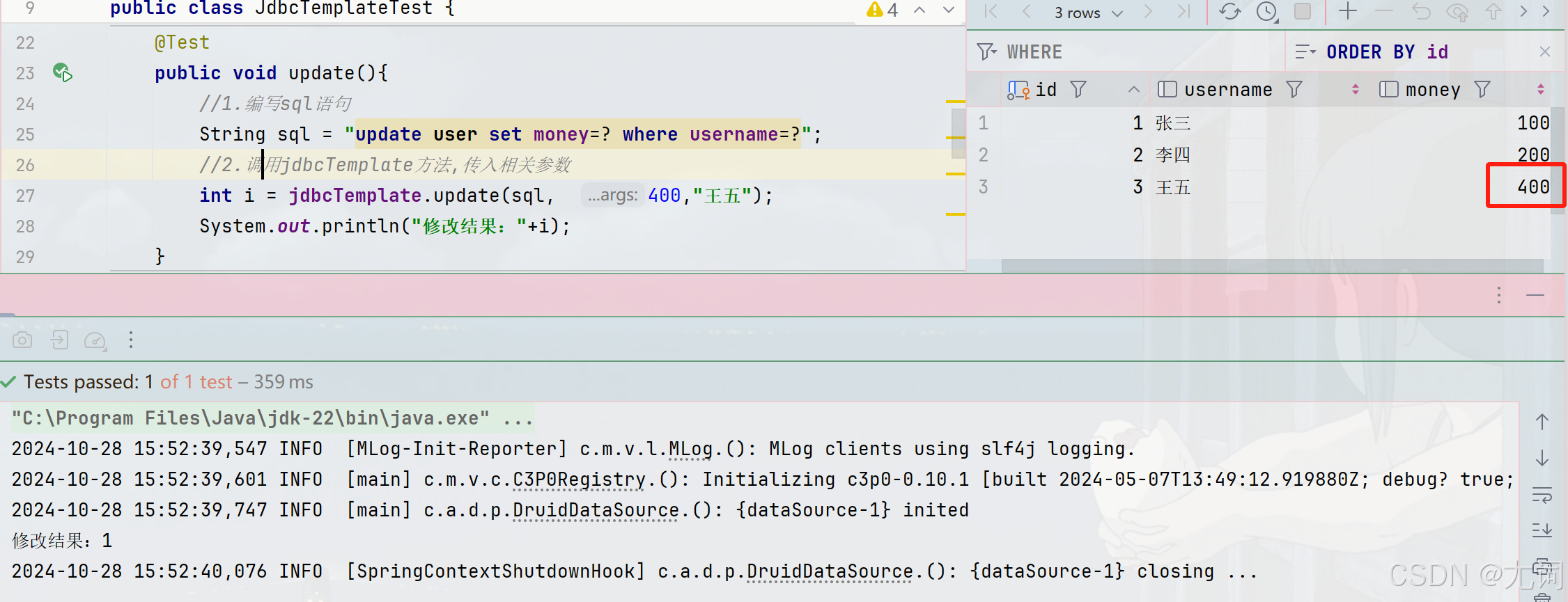 int i = jdbcTemplate.update(sql, 400,"王五");
