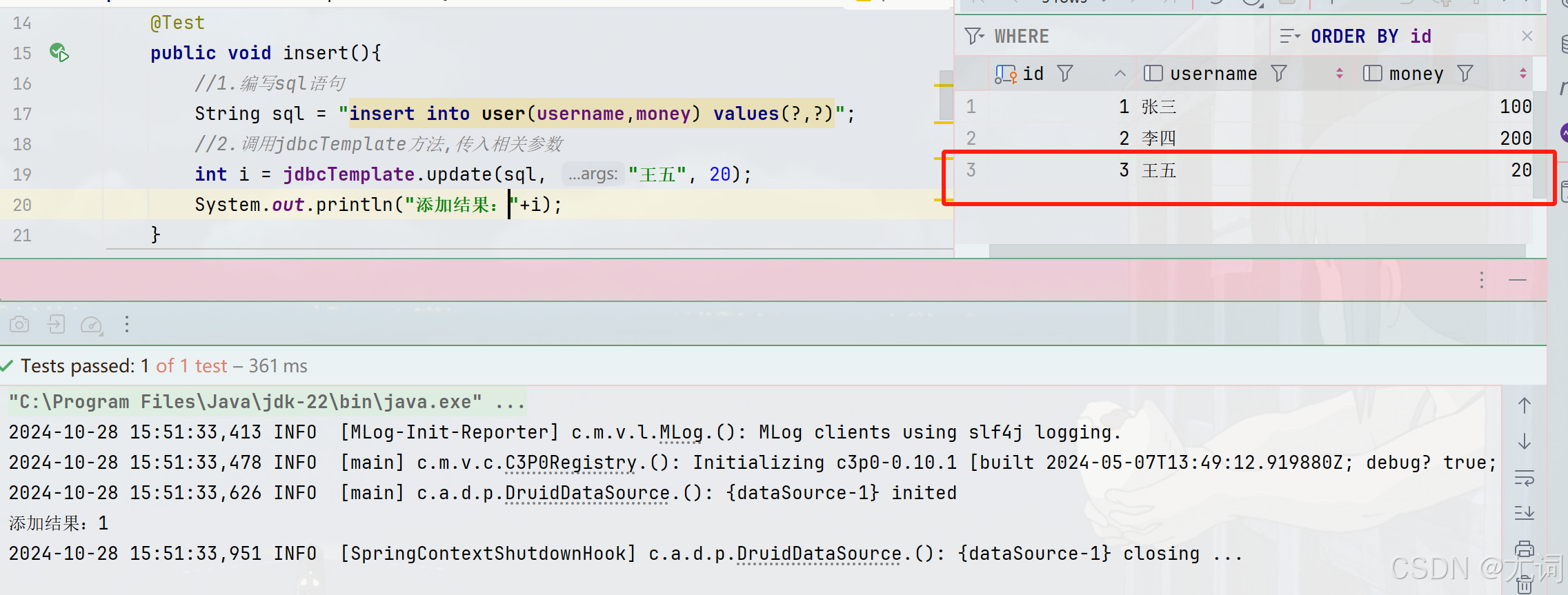 int i = jdbcTemplate.update(sql, "王五", 20);
