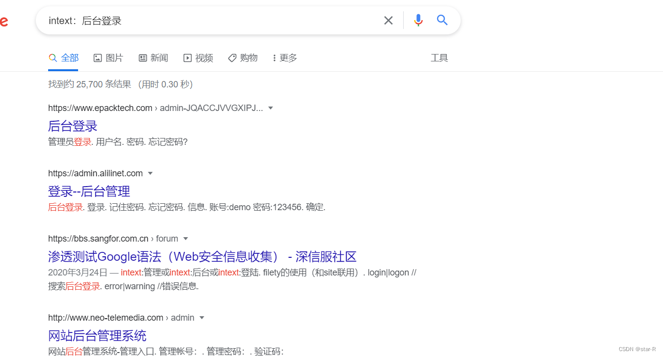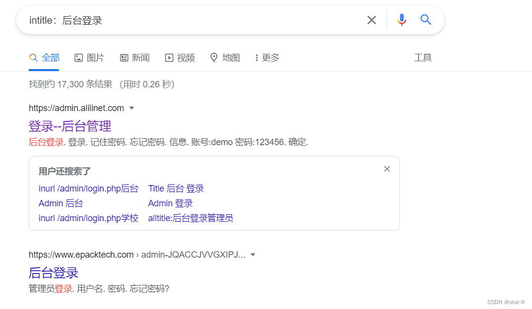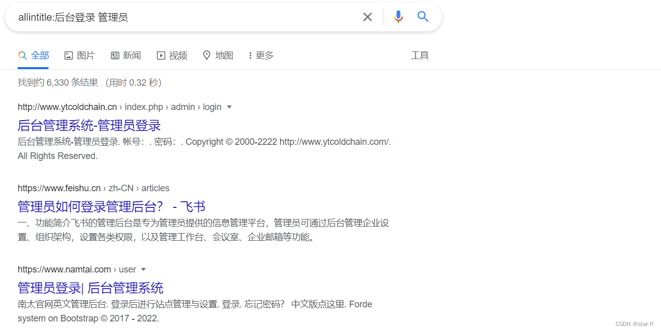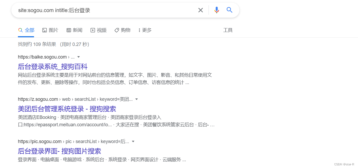 如下图所示:在sogou.com上搜索标题为后台登陆的网页(intitle:后台登录)