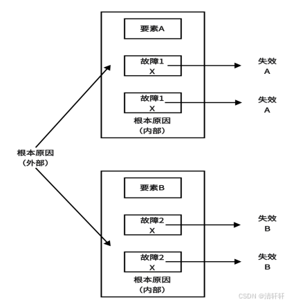 共因失效:一个相关项中,由一个单一特定事件或者根本原因(共因源)引起的两个或者多个要素的失效。