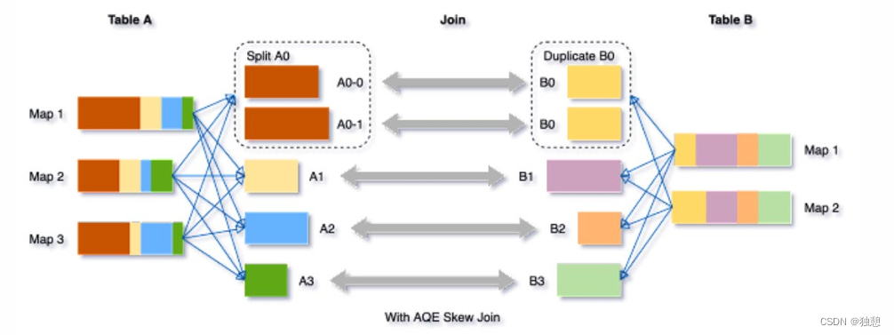 skew joins可能导致负载的极端不平衡,并严重降低性能。在AQE从shuffle文件统计信息中检测到任何倾斜后,它可 以将倾斜的分区分割成更小的分区,并将它们与另一侧的相应分区连接起来。这种优化可以并行化倾斜处理,获得更 好的整体性能。