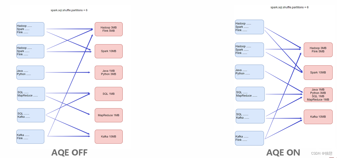 可以动态调整shuffle分区的数量。用户可以在开始时设置相对较多的shuffle分区数,AQE会在运行时将相邻的小分区 合并为较大的分区。