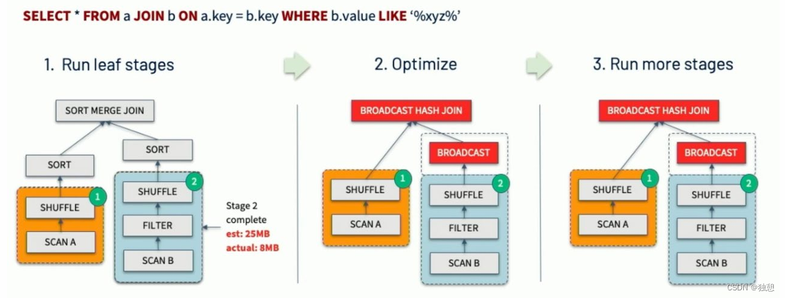 此优化可以在一定程度上避免由于缺少统计信息或着错误估计大小(当然也可能两种情况同时存在),而导致执行计 划性能不佳的情况。这种自适应优化可以在运行时sort merge join转换成broadcast hash join,从而进一步提升性能