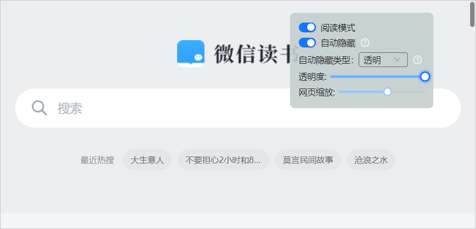 打开软件之后会动隐藏掉微信读书网页版多余的内容,只显示核心区域。在右上角可以开启鼠标移开自动隐藏,调整透明度等