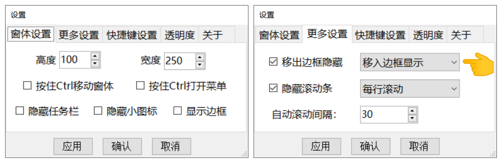 这款软件也支持鼠标移开自动隐藏,唯一区别就是不会在鼠标移入的时候又自动显示,必须按快捷键 Alt+E 才能显示!