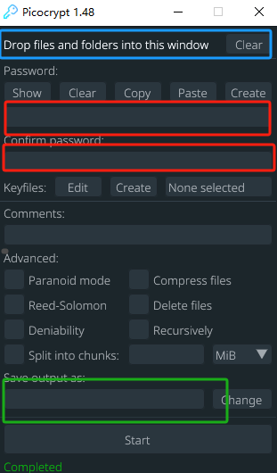 1.蓝色框为添加文件-直接将想要加密的文件或者图片等拉入即可