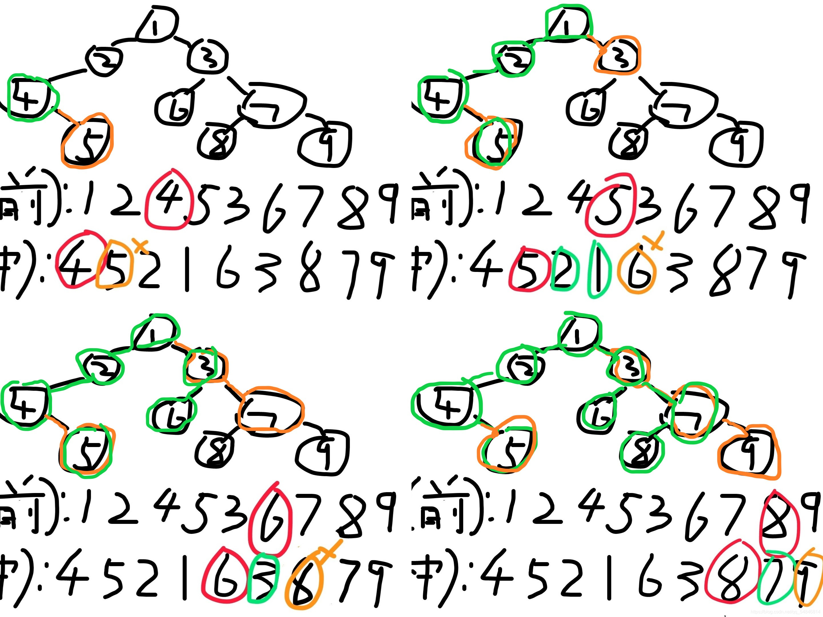 下面证明每次中序序列前进时第一个未在前序序列中出现的节点的前一个结点是前序序列中下一个结点的父亲(父亲和右孩子)