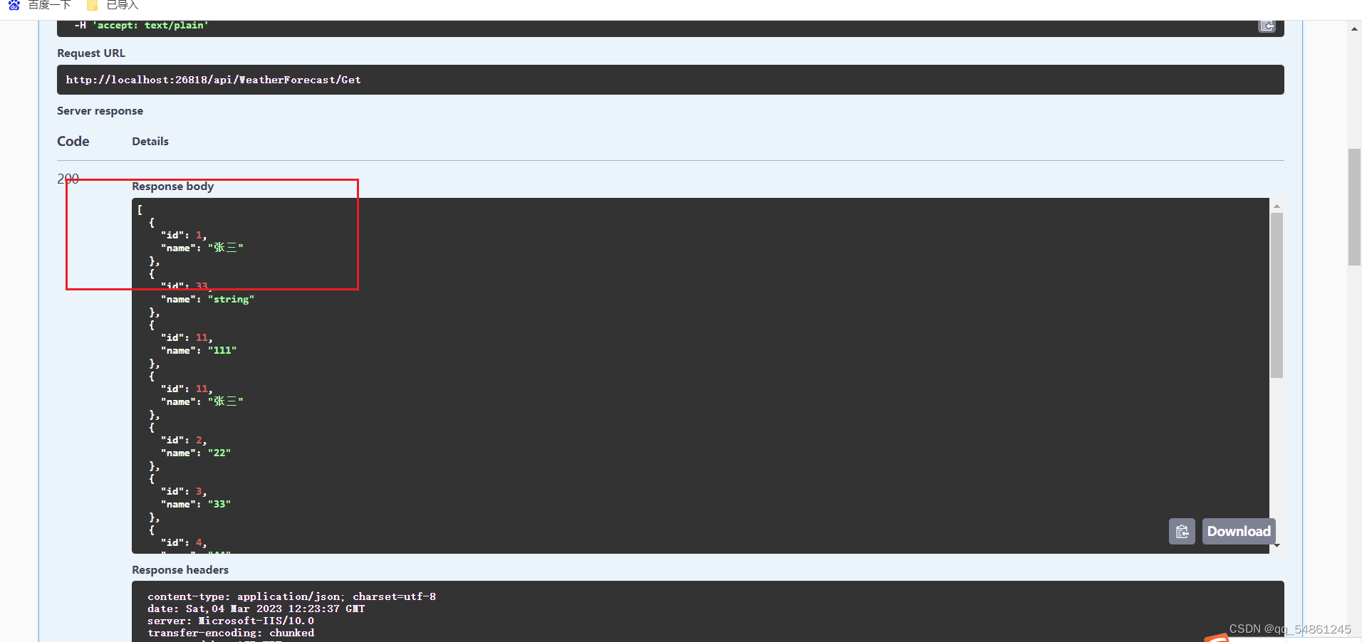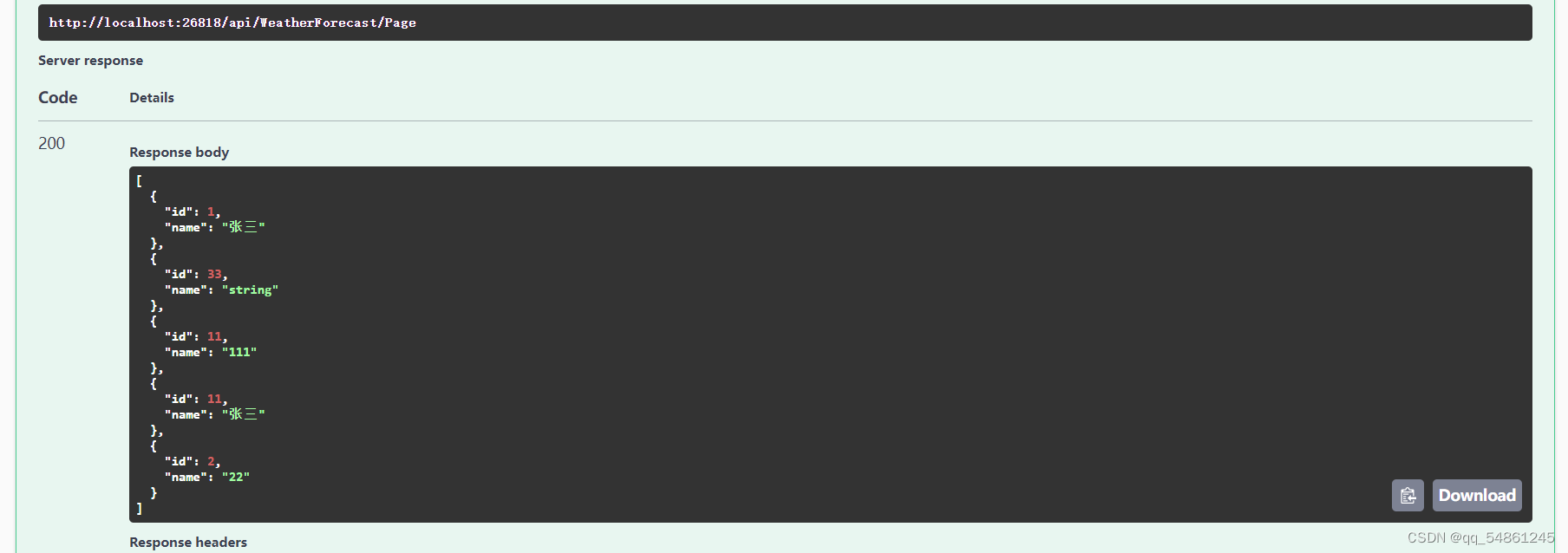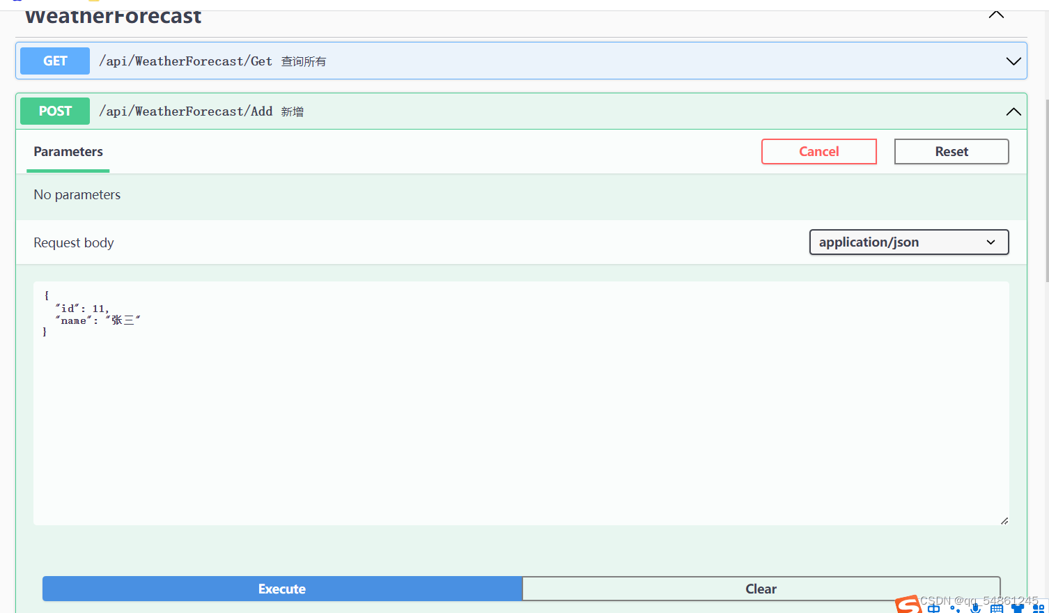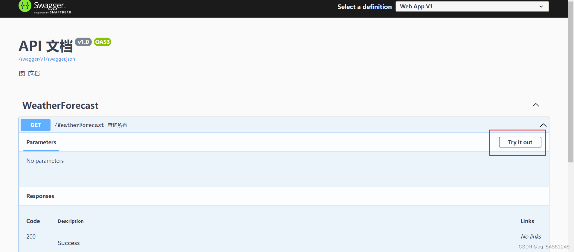 可以看到新加的控制器已经显示在这个接口文档里了,咱们可以直接点击Try it out --->Execute来运行一下这个查询所有的程序