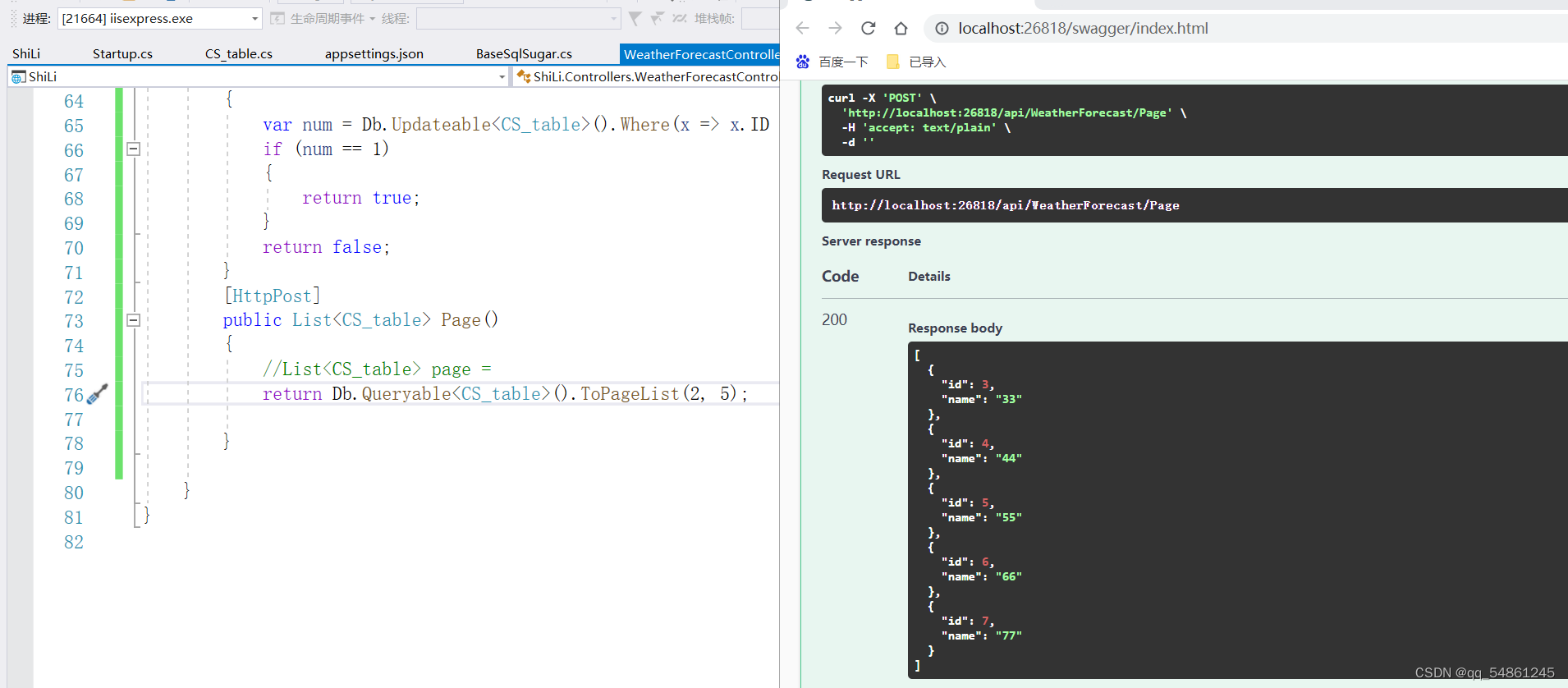 注意一下:我这是为了方便演示SqlSugarClient提供的基础功能,就把这连接数据库操作都写在控制器上了,一般情况下为了代码的可维护性是不允许直接写在控制器里写太过于复杂的操作的。