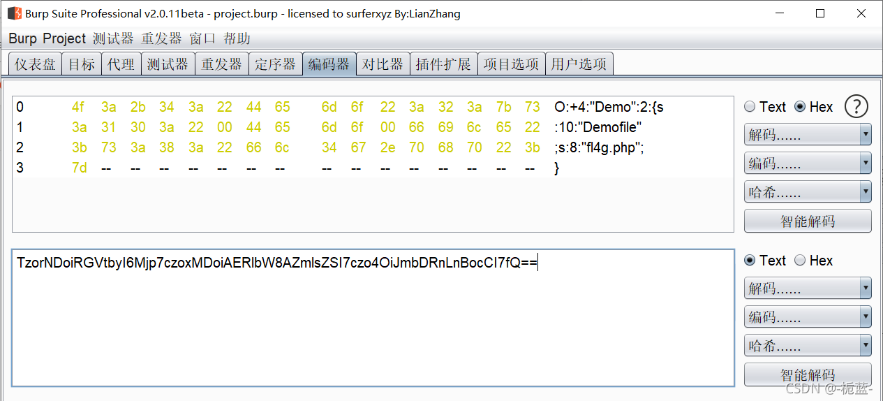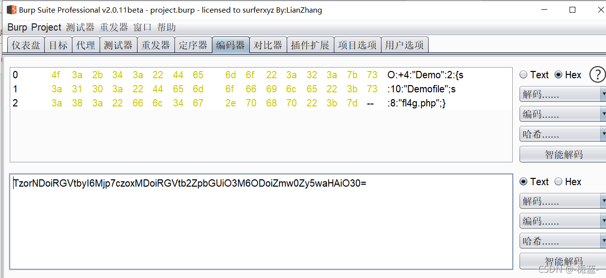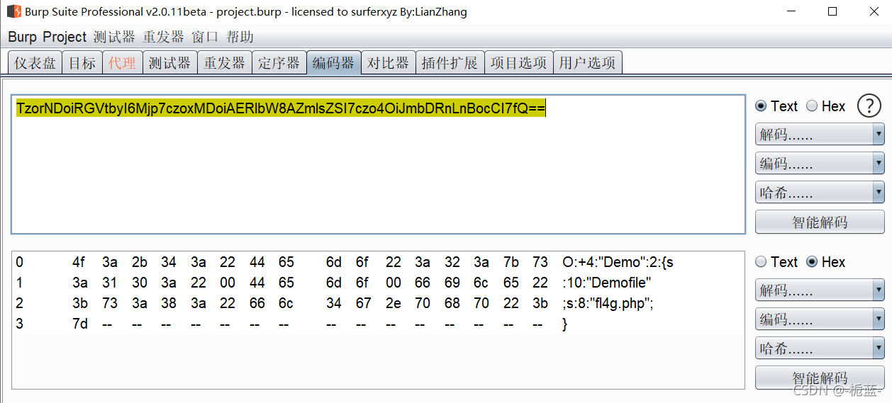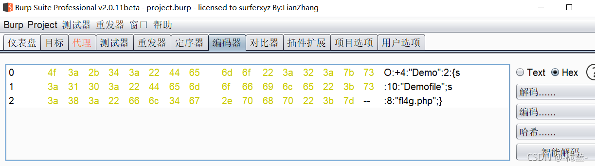 这就是为什么private化的file序列化后变成了Demofile并且还是10个字符(包括了两个空字符)而且%00是不会显示出来的,因为浏览器会自动解析%00,因此我们如果不用php里面的函数的话,直接自己修改数据是不会产生这个空字符的,我们必须自己去加上这个空字符,在D的左边和o的右边,我们需要用一些工具来看看,比如burpsuite的decord模块看看