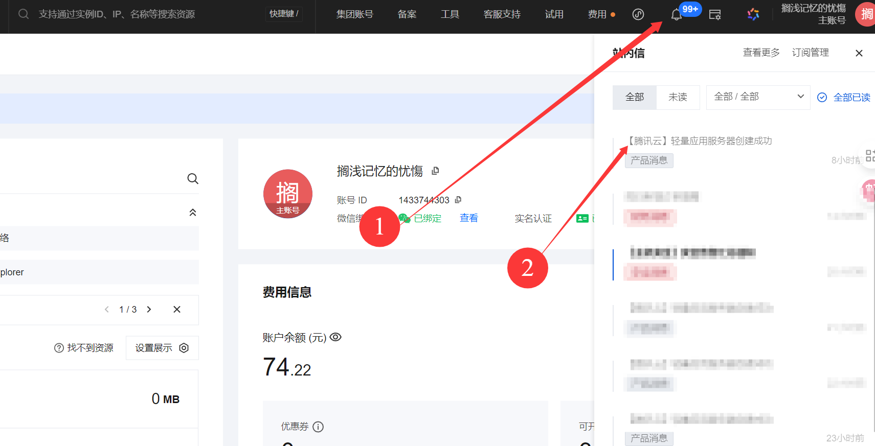 在服务器购买完成后过几分钟会有一条站内信,告诉我们服务器ip和密码