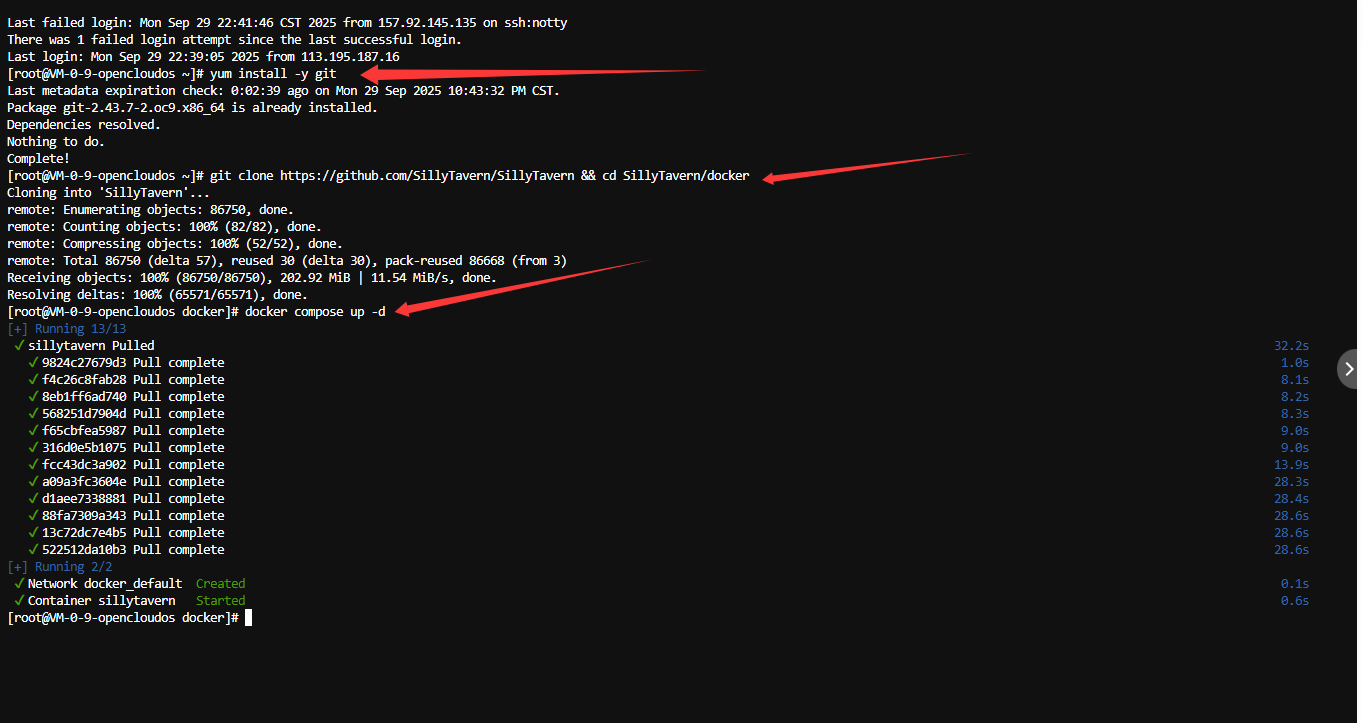 在宝塔中打开「终端」或直接用 SSH,执行以下命令安装与拉起 SillyTavern: