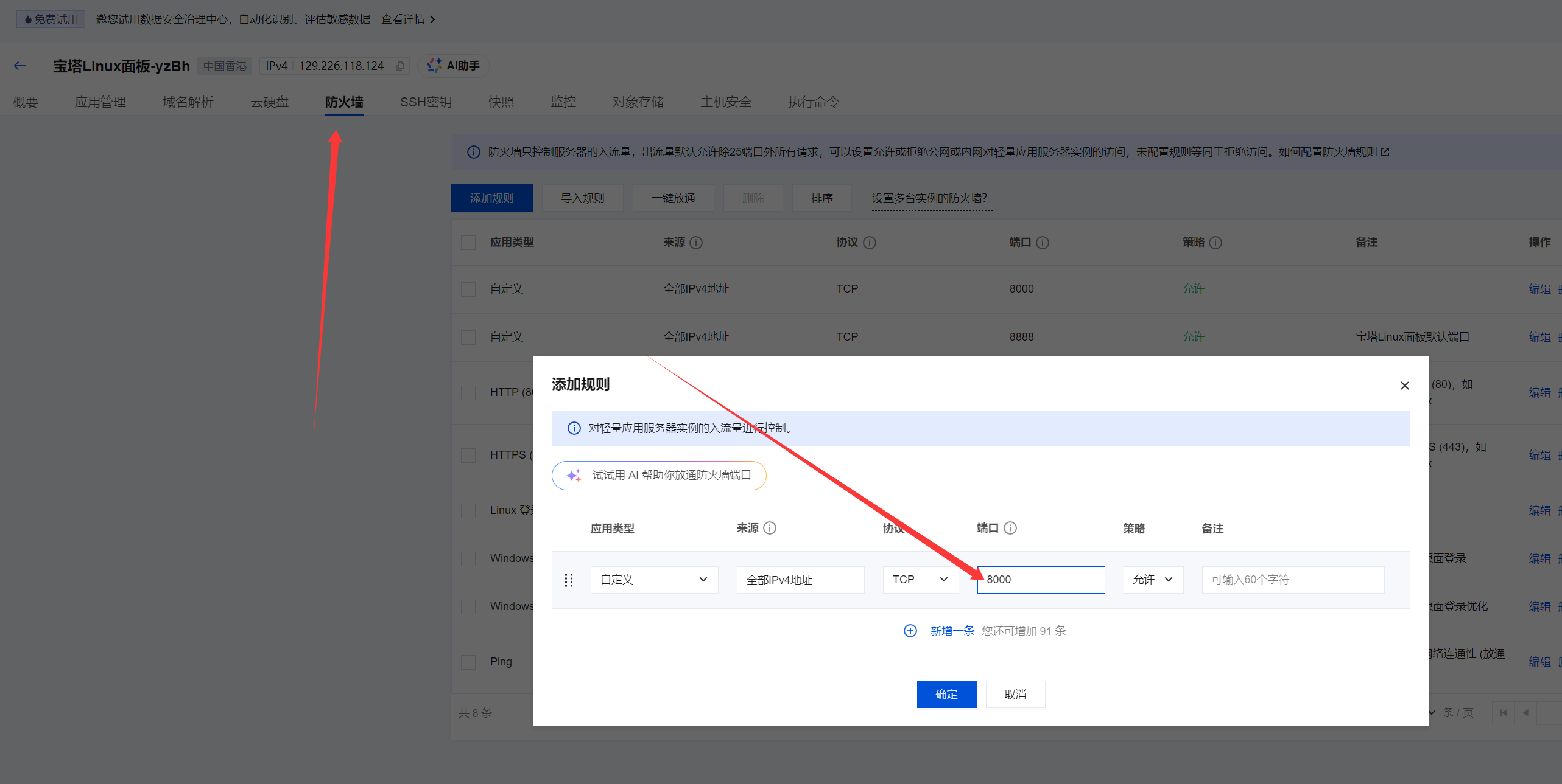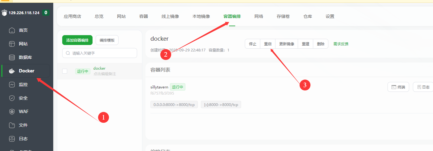 打开容器(docker)重启。在 腾讯云安全组 放行 TCP 8000;若使用宝塔防火墙,也需同步放行 8000 端口。