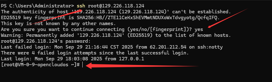 这里告知服务器密码是fmZ]9sd3N/+7,打开win面板下的终端,输入 ssh root@IP 2.yes 3.输入密码,密码不会显示出来