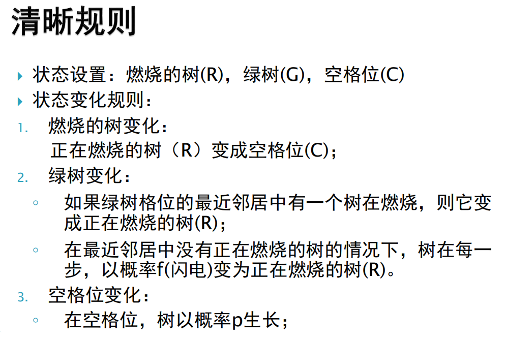# 传入参数为:(1)当前的燃烧矩阵;(2)空格位 树的生长概率p;(3)正常位 树的燃烧概率f