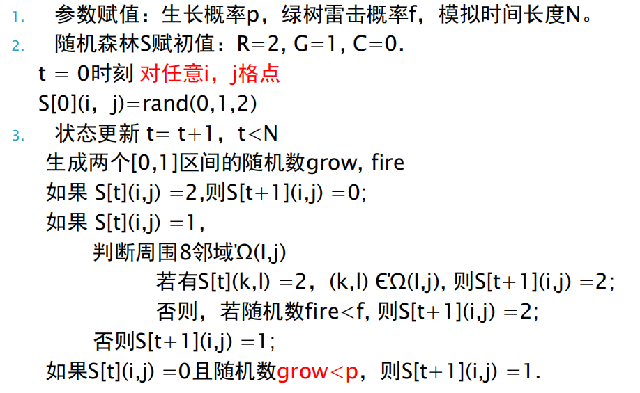 (4)在最近的邻居中没有正在燃烧的树的情况下,树以概率 f (闪电)变为正在燃烧的树