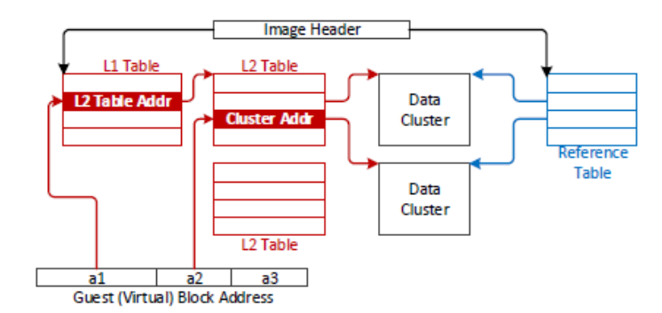 - L1 表: 第一级,可变大小,在文件中连续。表中的条目指向 L2 表。快照的核心就是切换活跃的 L1 表。