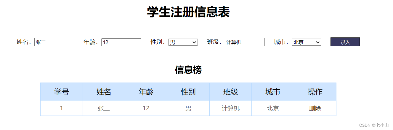 要求:根据输入的内容注册学生信息,点击录入按钮增加学生信息列,点击对应的删除按钮可以删除对应的信息列