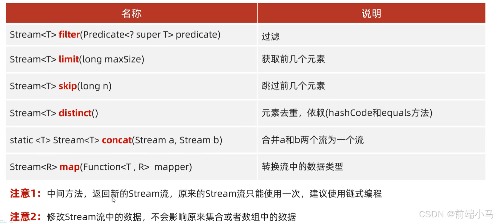 //注意1:中间方法,返回新的stream流,原来的stream流只能使用一次,建议使用链式编程 //注意2:修改stream流中的数据,不会影响原来集合或者数组中的数据 ArrayList<String> list = new ArrayList<>(); ArrayList<String> list2 = new ArrayList<>(); ArrayList<String> list3 = new ArrayList<>(); Collections.addAll(list,"张无忌","周芷若","赵敏","赵敏","赵敏","张强","张三丰","张小四","张小五"); Collections.addAll(list2,"小王","小李"); Collections.addAll(list3,"小王-23","小李-24"); //filter 过滤 list.stream().filter(s -> s.startsWith("张")) .filter(s -> s.length()==3) .forEach(s -> System.out.println(s)); //limit 获取前几个元素 list.stream().limit(3).forEach(s -> System.out.println(s)); //skip 跳过前几个元素 list.stream().skip(4).forEach(s -> System.out.println(s)); //distinct 元素去重,依赖(hashCode和equals) list.stream().distinct().forEach(s -> System.out.println(s)); //concat 合并a和b两个流为一个流 Stream.concat(list.stream(),list2.stream()).forEach(s -> System.out.println(s)); //map 转换流中的数据类型 //第一个类型:流中原本的数据类型 //第二个类型:要转成之后的类型 //apply的形参s:依次表示流里面的每一个数据 //返回值:表示转换之后的数据 //当map方法执行完毕之后,流上的数据就变成了整数 //所以在下面forEach当中,s依次表示流里面的每一个数据,这个数据现在就是整数了 list3.stream().map(new Function<String, Integer>() { @Override public Integer apply(String s) { String[] arr = s.split("-"); String ageStr = arr[1]; int age=Integer.parseInt(ageStr); return age; }} ).forEach(s -> System.out.println(s)); list3.stream() .map(s -> Integer.parseInt(s.split("-")[1])) .forEach(s -> System.out.println(s));