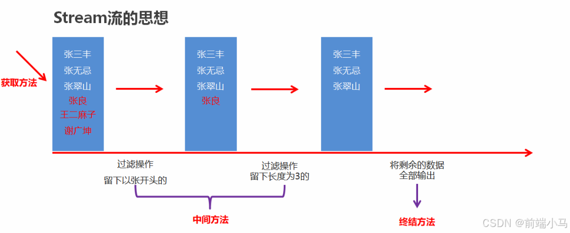 public class MyStream1 { public static void main(String[] args) { //集合的批量添加 ArrayList<String> list1 = new ArrayList<>(List.of("张三丰","张无忌","张翠山","王二麻子","张良","谢广坤")); //list.add() //遍历list1把以张开头的元素添加到list2中。 ArrayList<String> list2 = new ArrayList<>(); for (String s : list1) { if(s.startsWith("张")){ list2.add(s); } } //遍历list2集合,把其中长度为3的元素,再添加到list3中。 ArrayList<String> list3 = new ArrayList<>(); for (String s : list2) { if(s.length() == 3){ list3.add(s); } } for (String s : list3) { System.out.println(s); } } }使用Stream流示例代码: